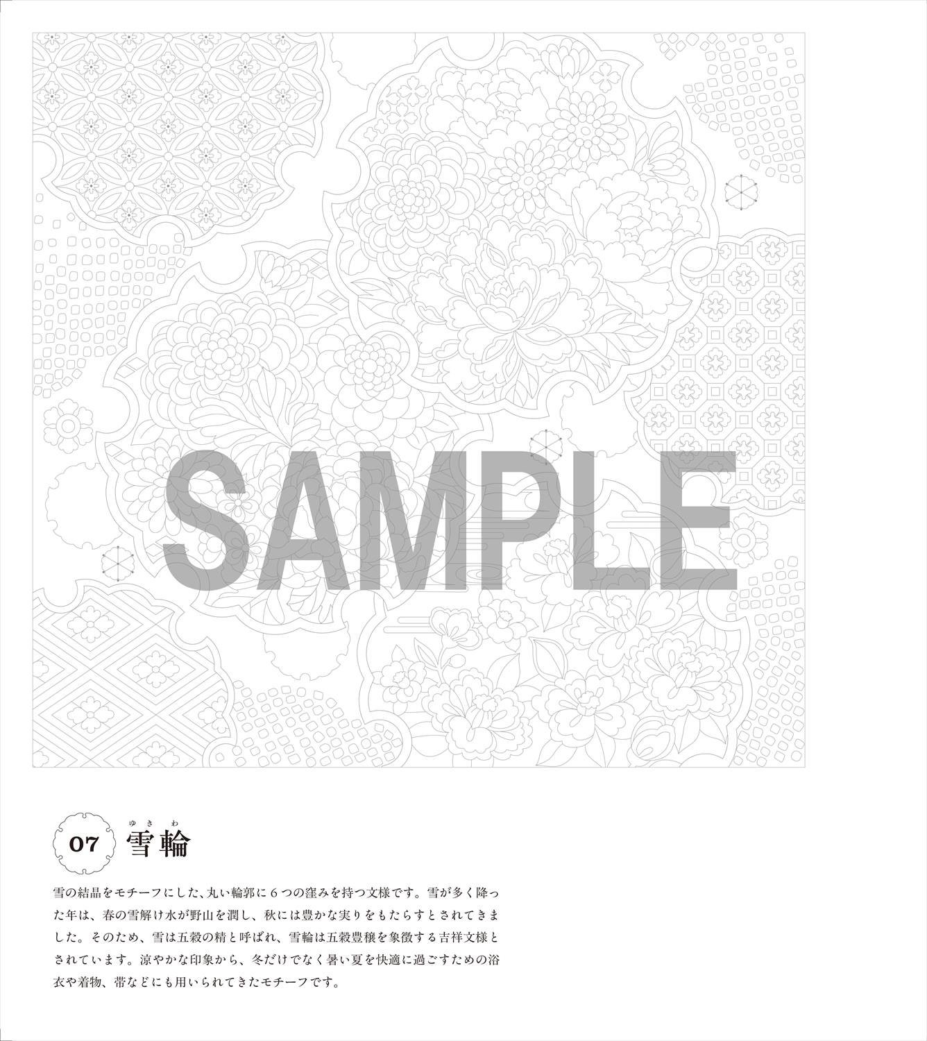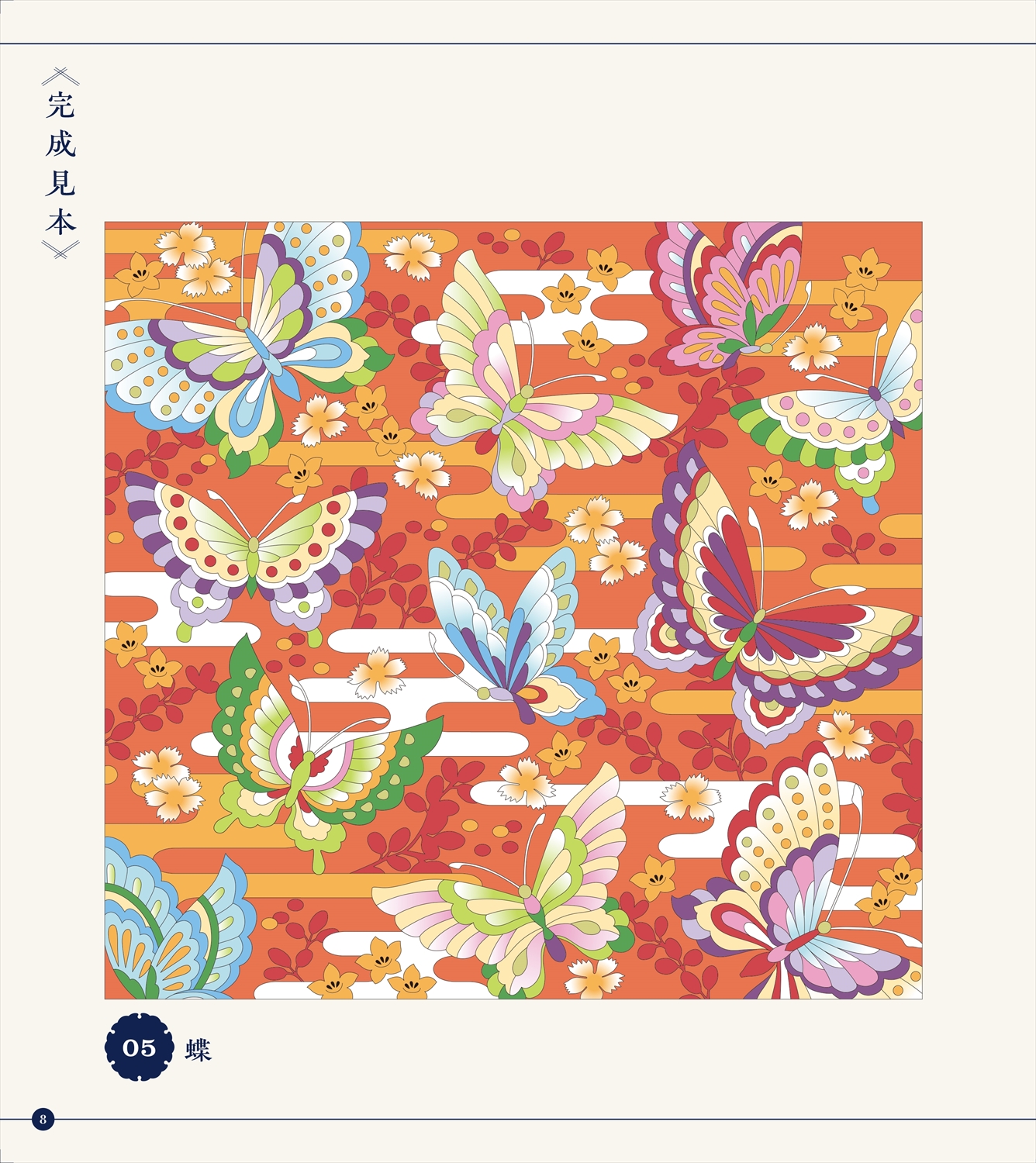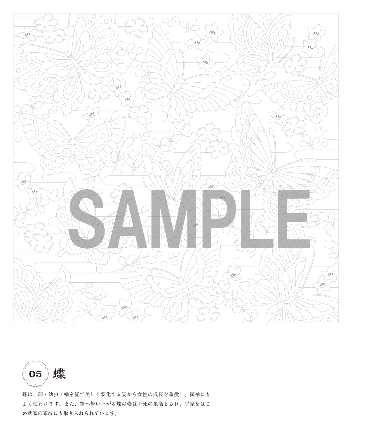 「花」「蝶」「鶴」「青海波(せいがいは)」「亀甲(きっこう)」など、日本の伝統を象徴する和柄を中心に、古の文化と美を感じさせる絵柄を多数収録。