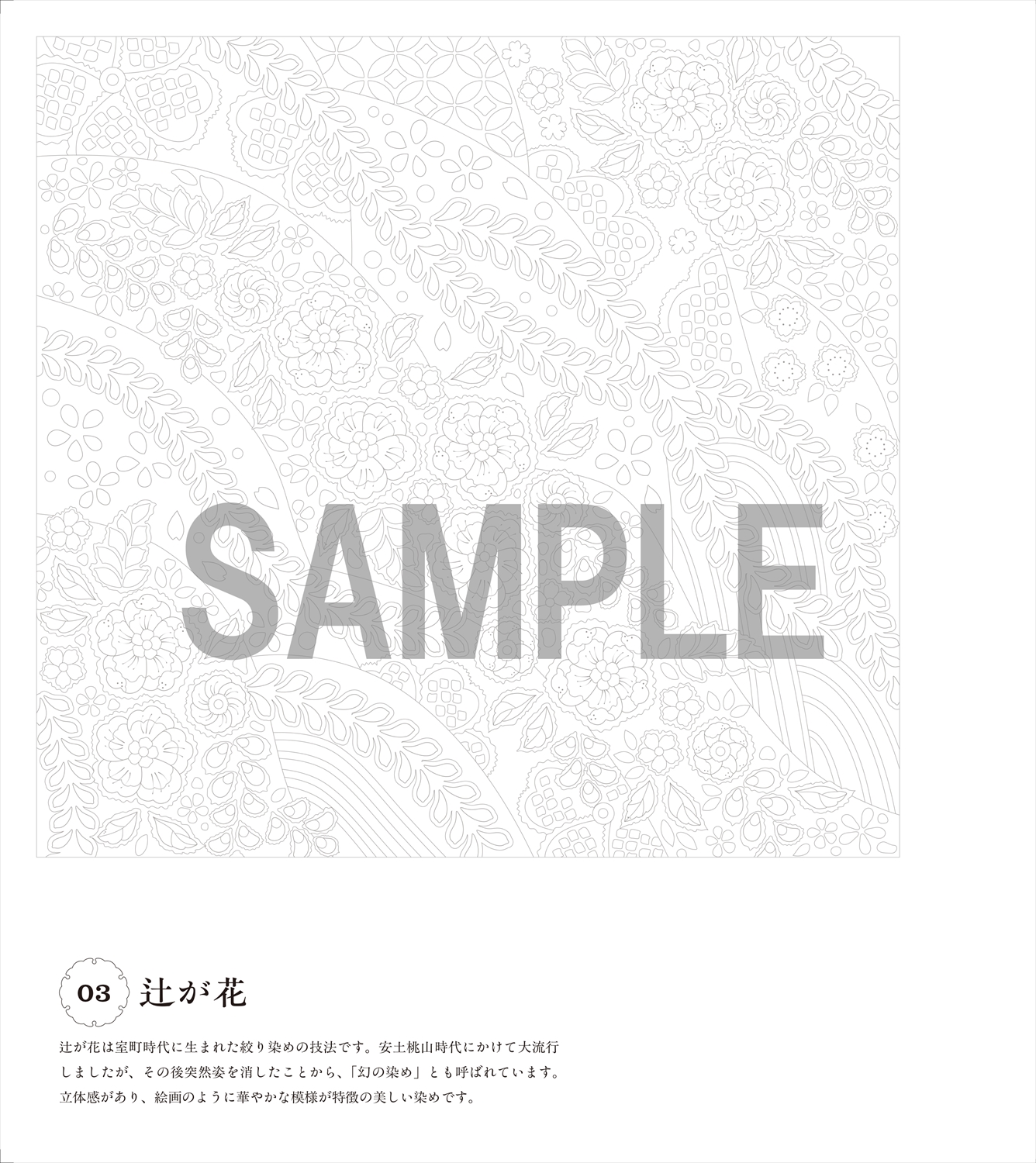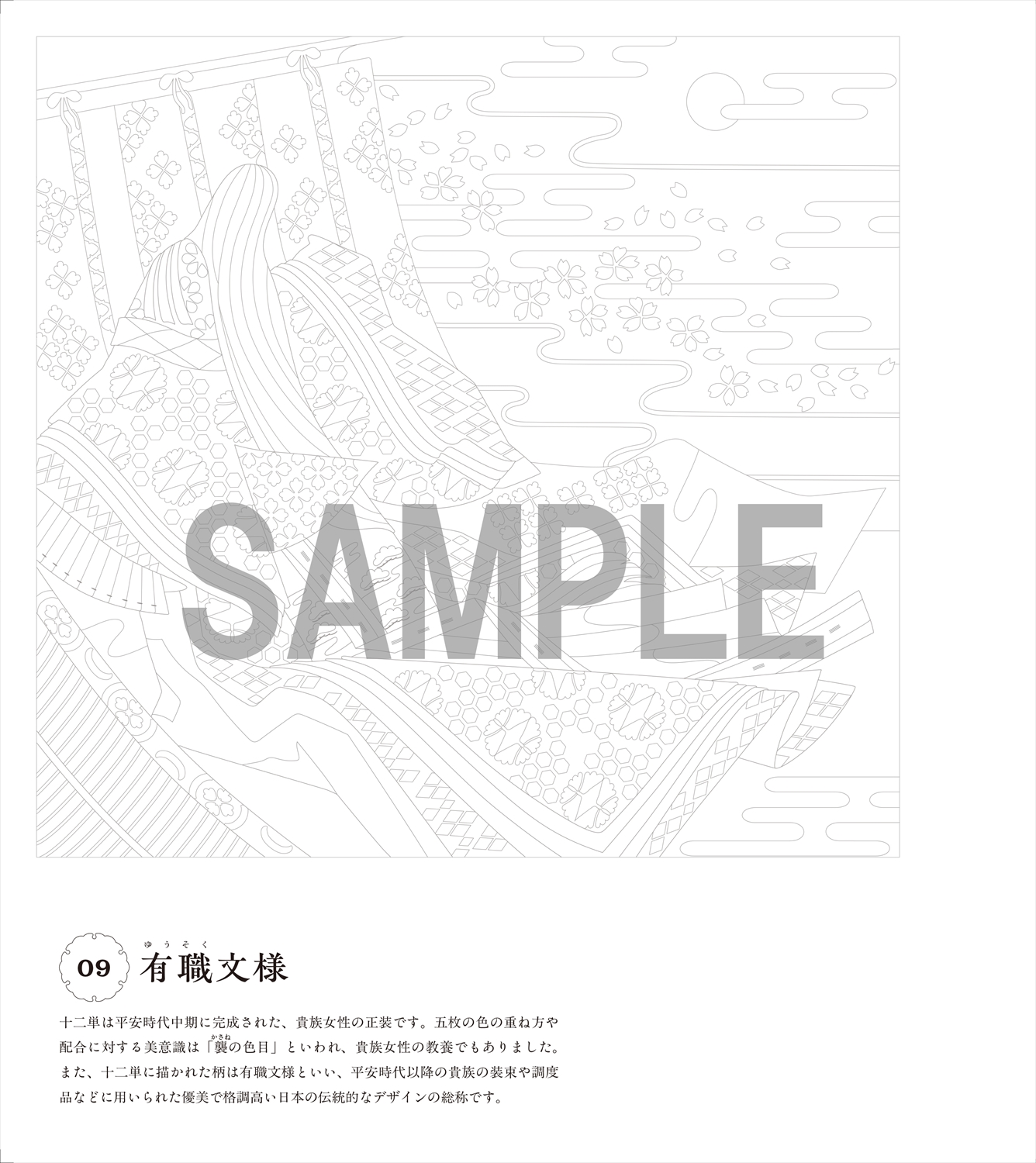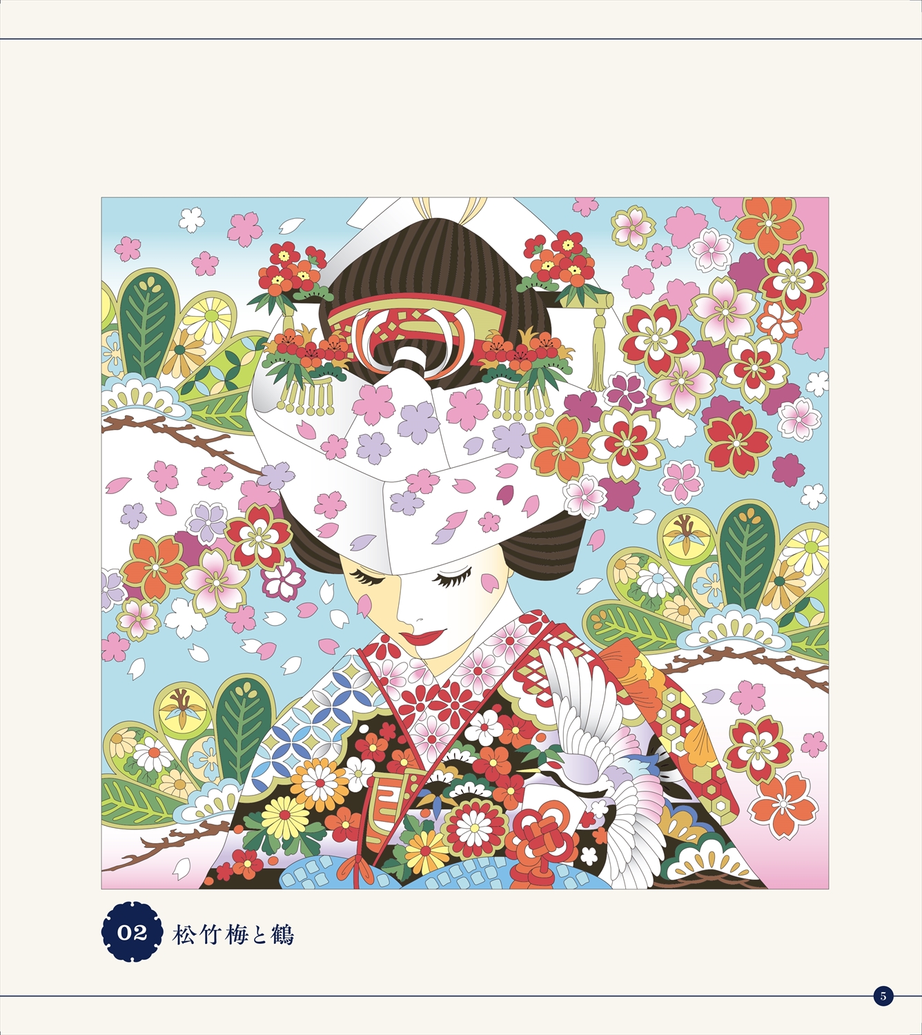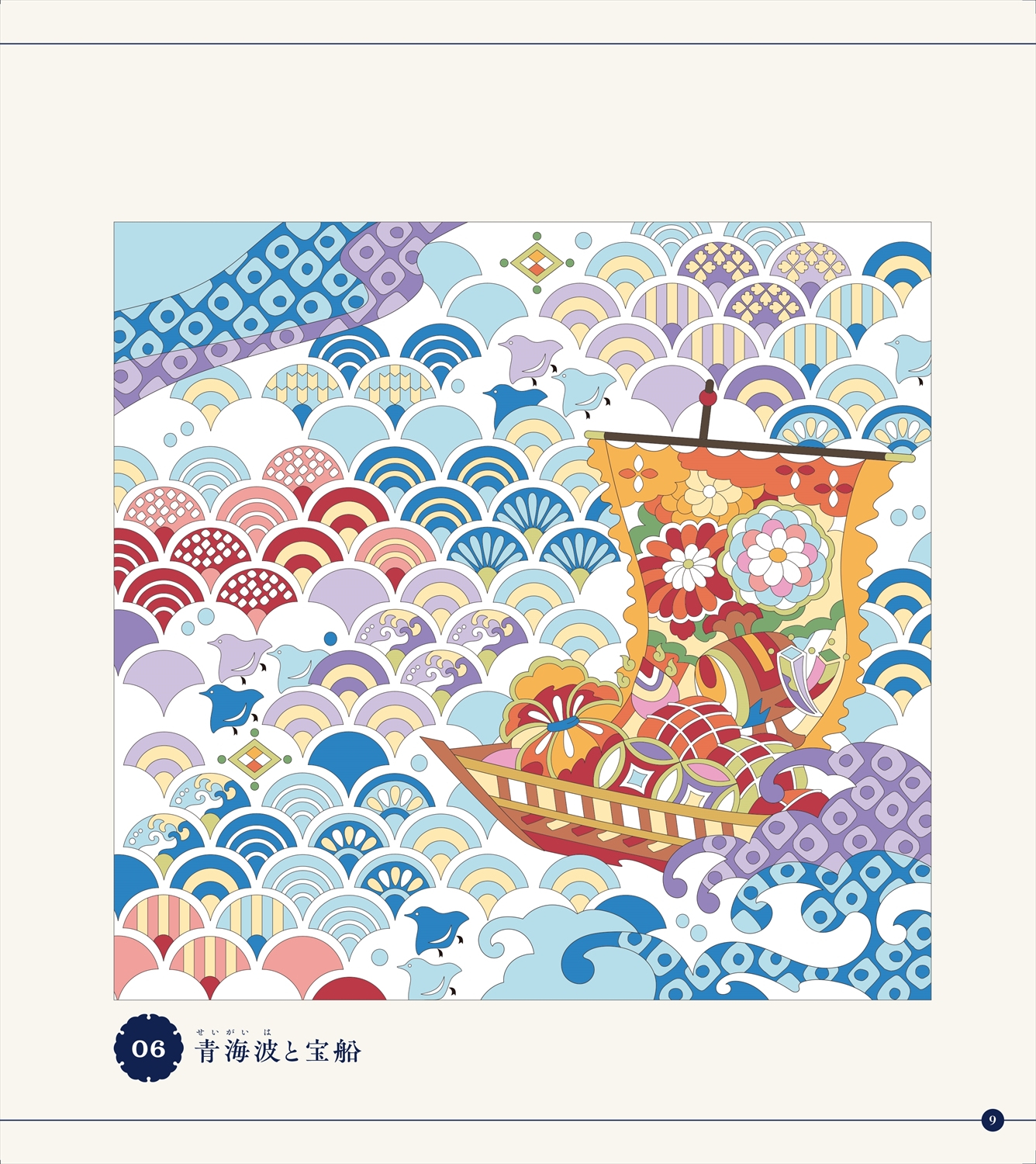 「花」「蝶」「鶴」「青海波(せいがいは)」「亀甲(きっこう)」など、日本の伝統を象徴する和柄を中心に、古の文化と美を感じさせる絵柄を多数収録。