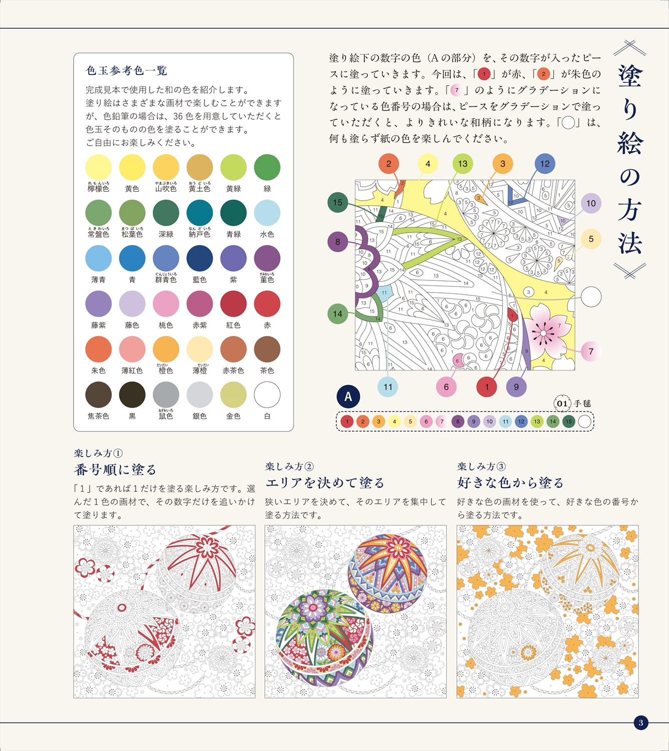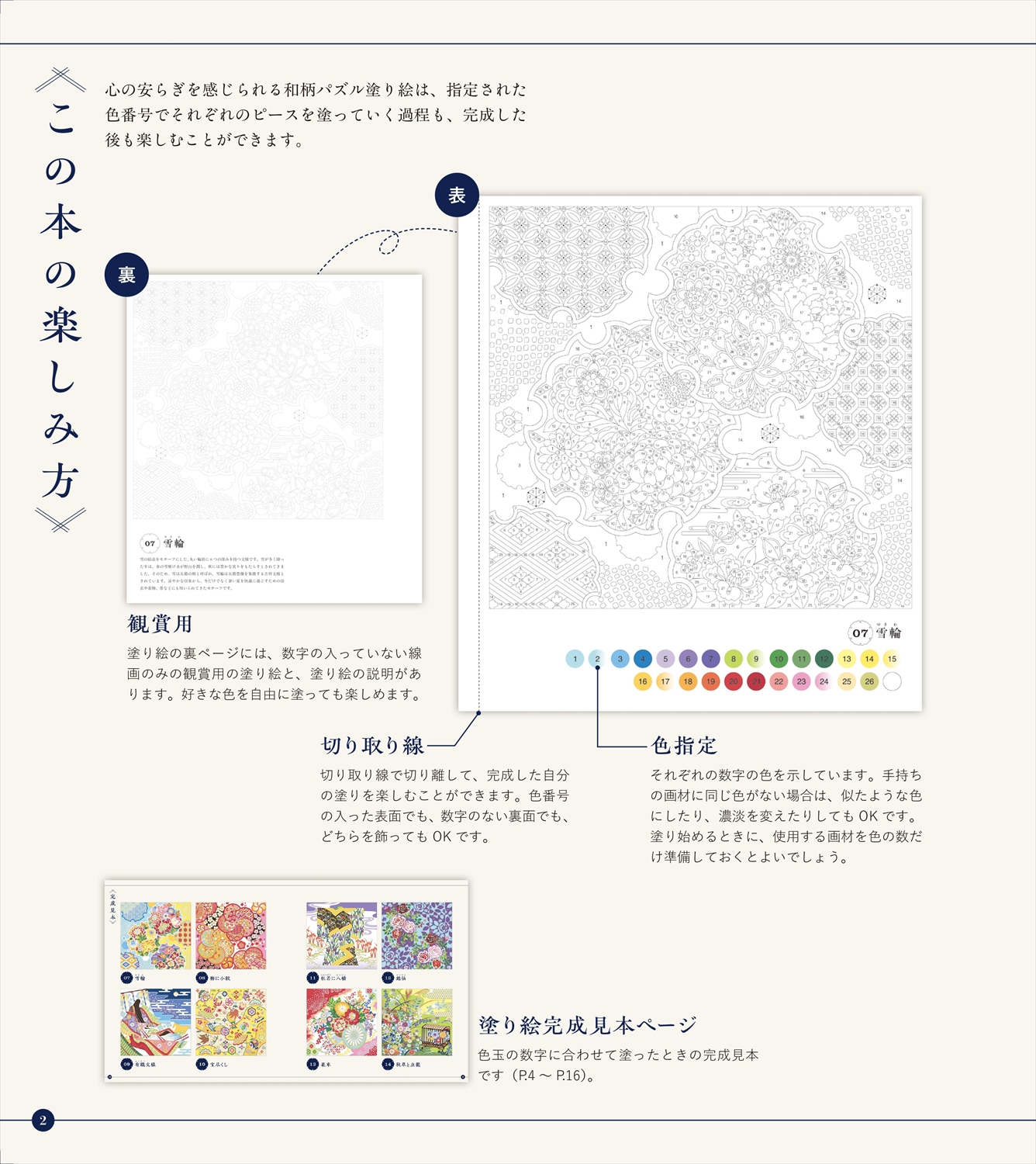 番号に従って色を塗るだけで、少しずつ美しい和柄イラストが完成していくため、絵が苦手な方でも気軽に楽しむことができます。無心で取り組むことで集中力を高め、心と脳を整えるリラクゼーション効果も期待できます。