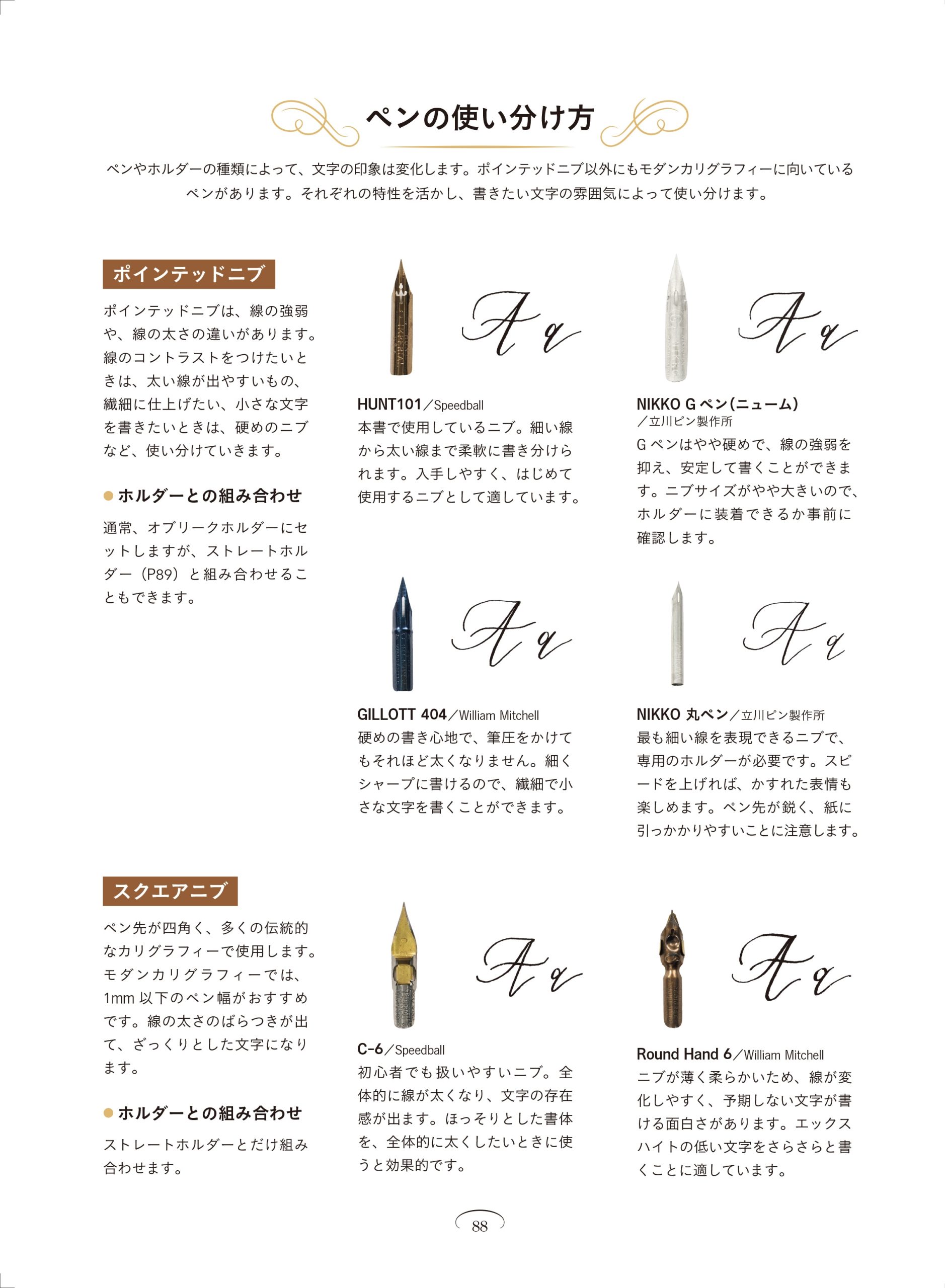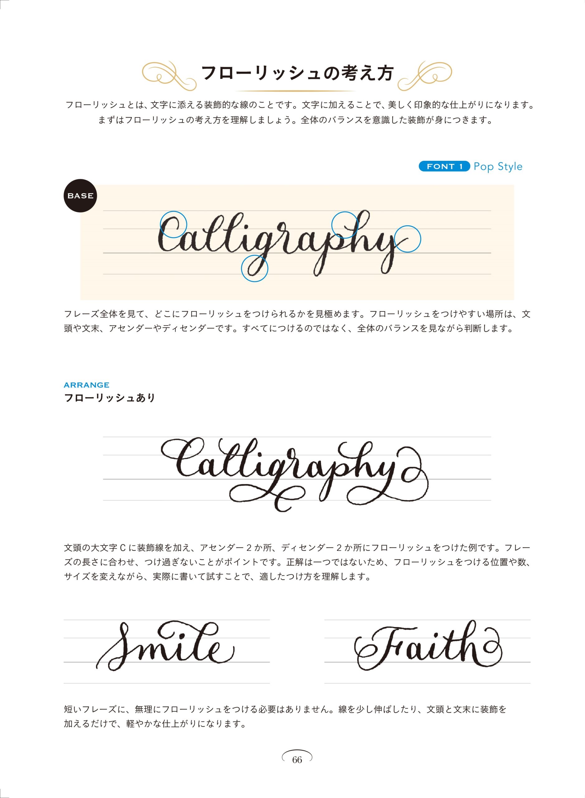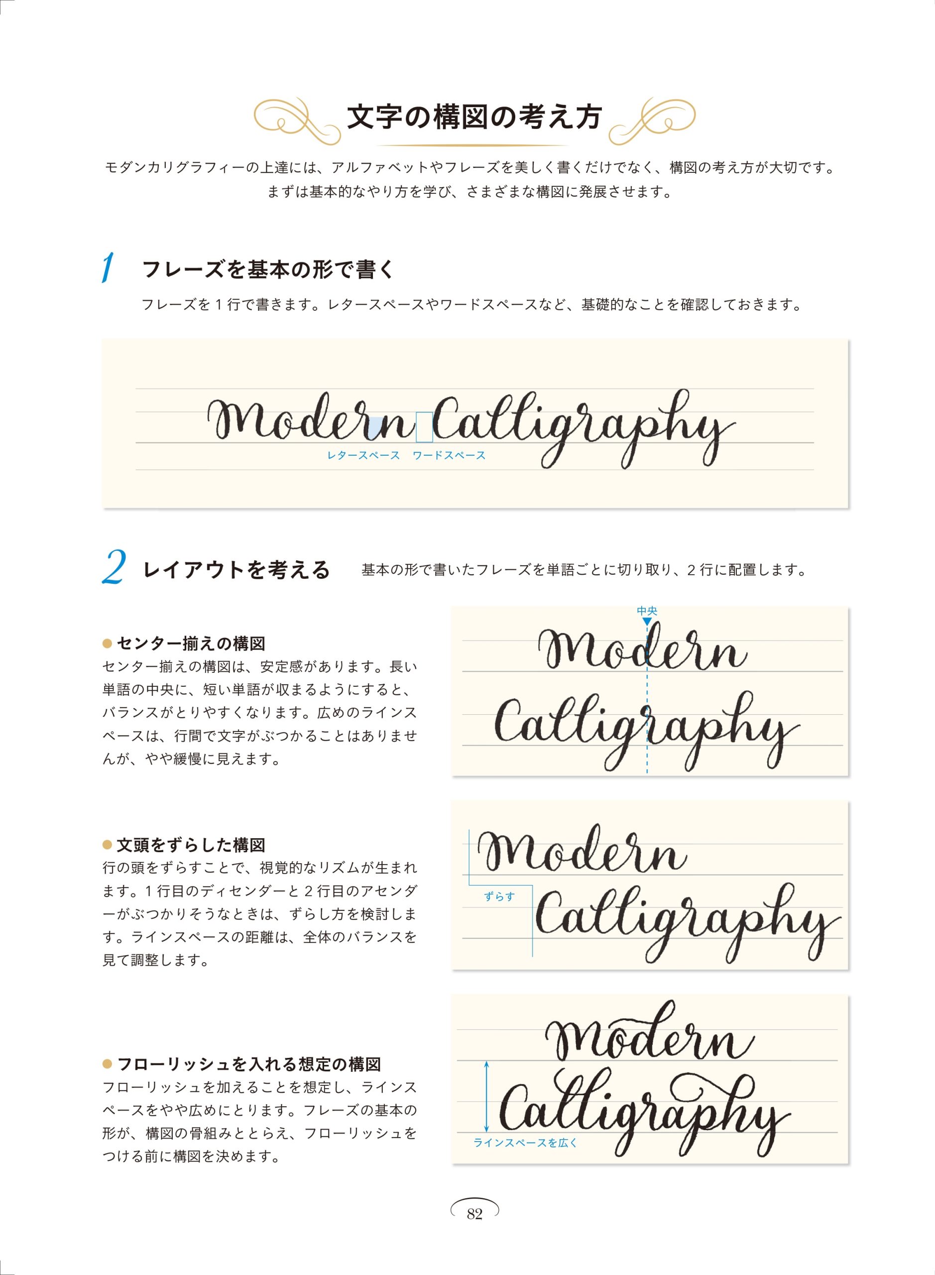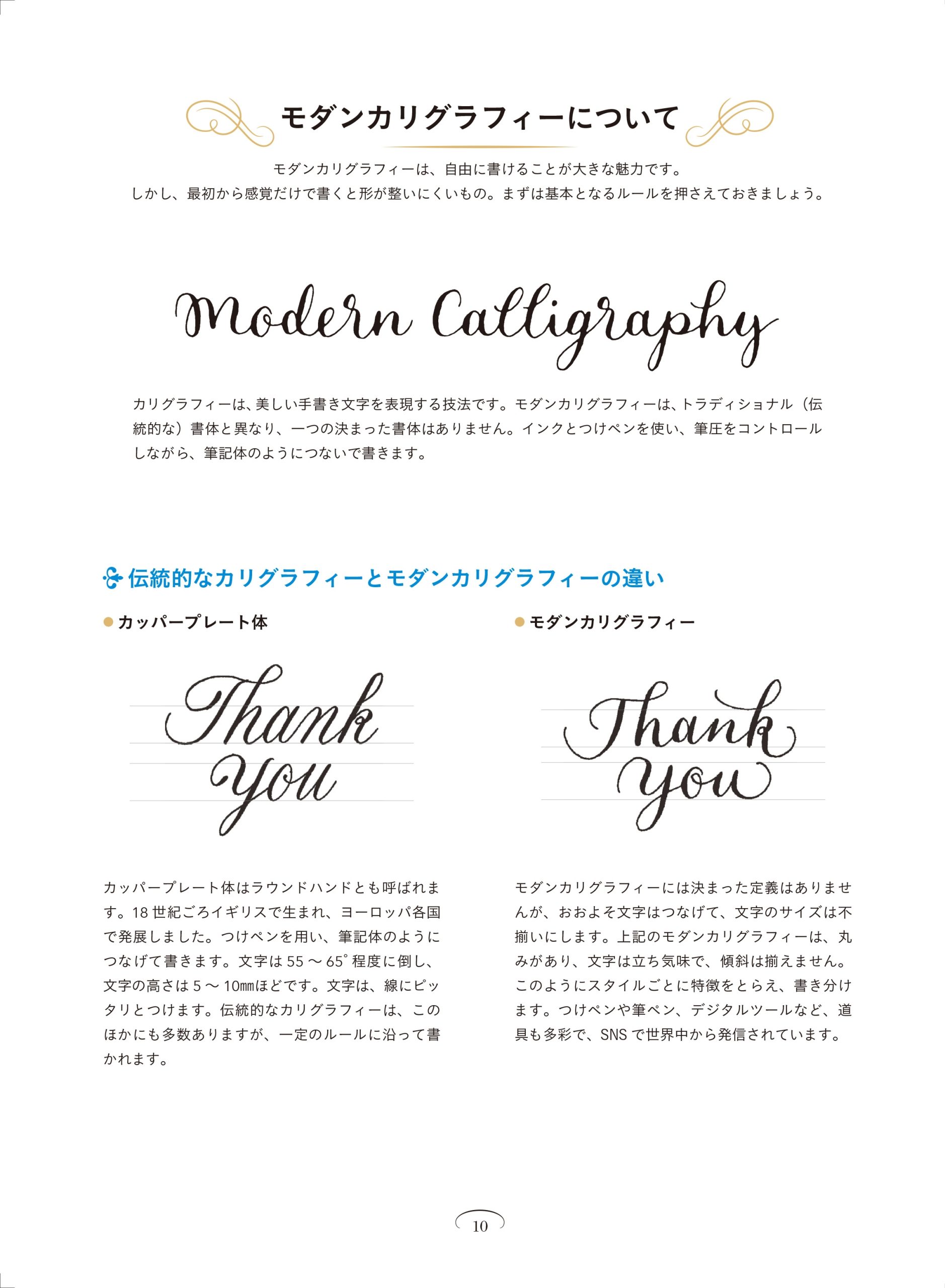 カリグラフィーの初心者でも自由に文字が描けるように、伝統的なルールに基づいた文字の傾きや位置、複数の文字のつなげ方、文字同士の空きやフローリッシュ(文字の周りにつける手書きの装飾線)の描き方などを丁寧に解説。そのうえで、典型的な5つのモダンカリグラフィーの書き方をレクチャーします。
