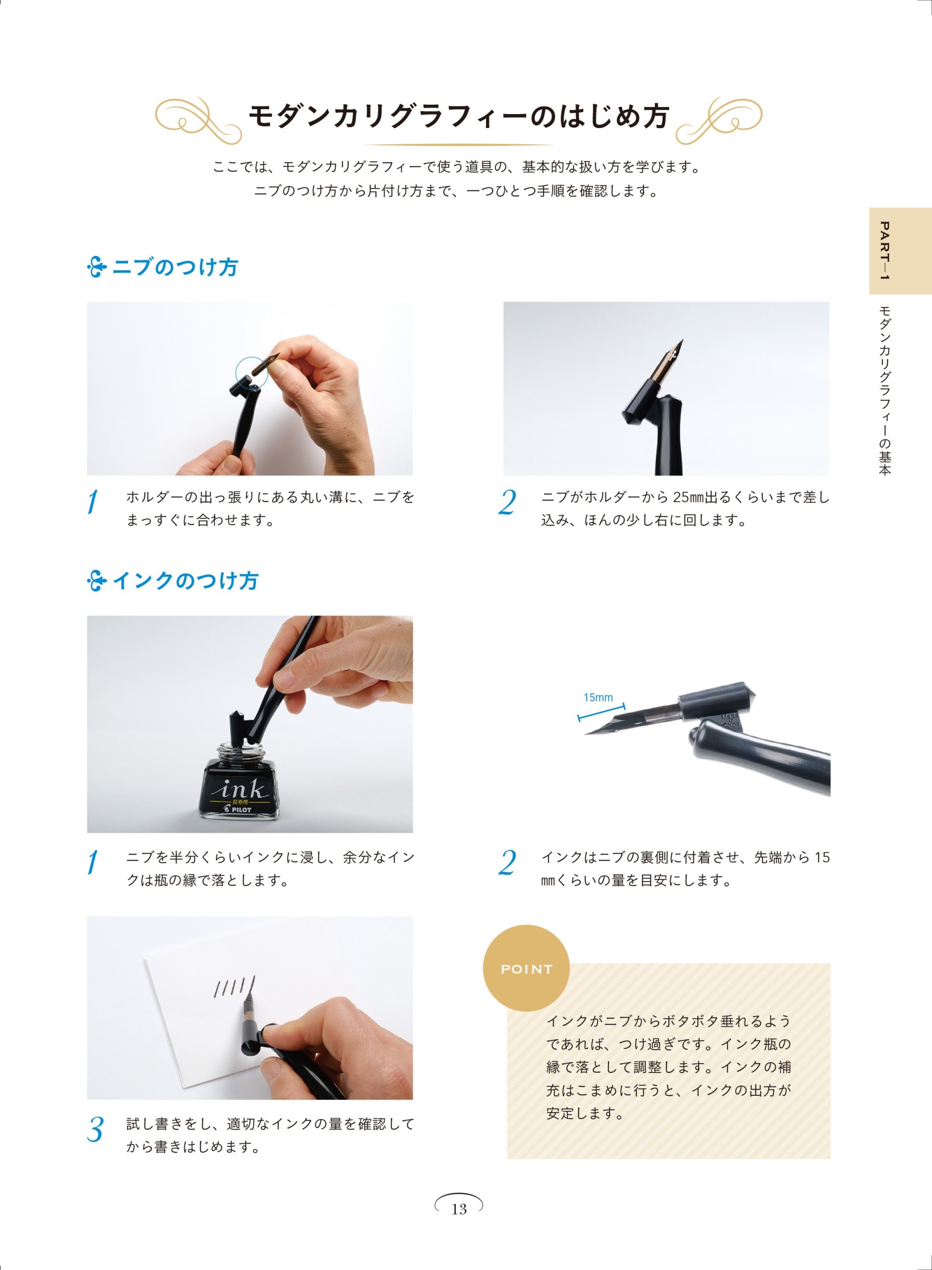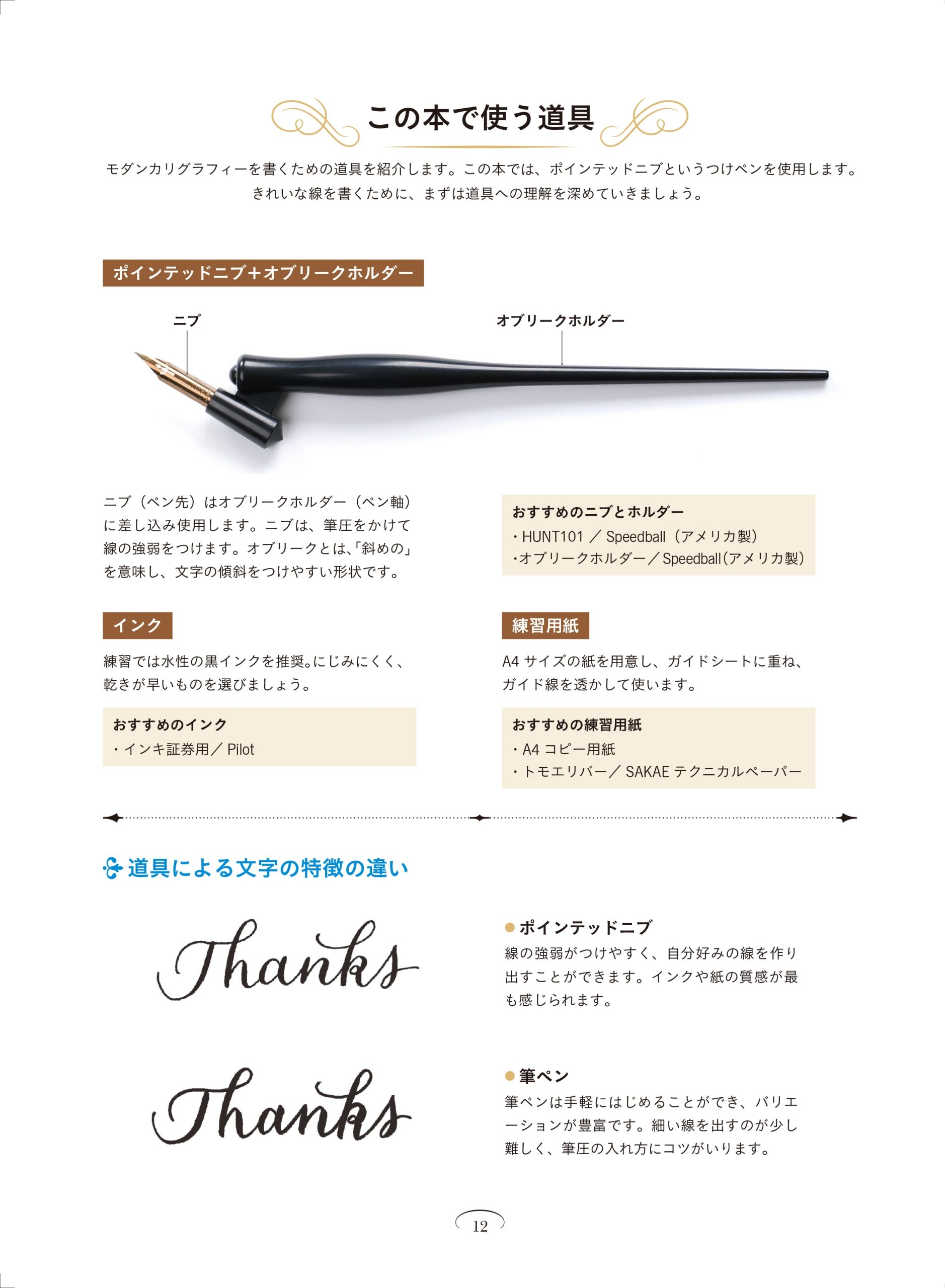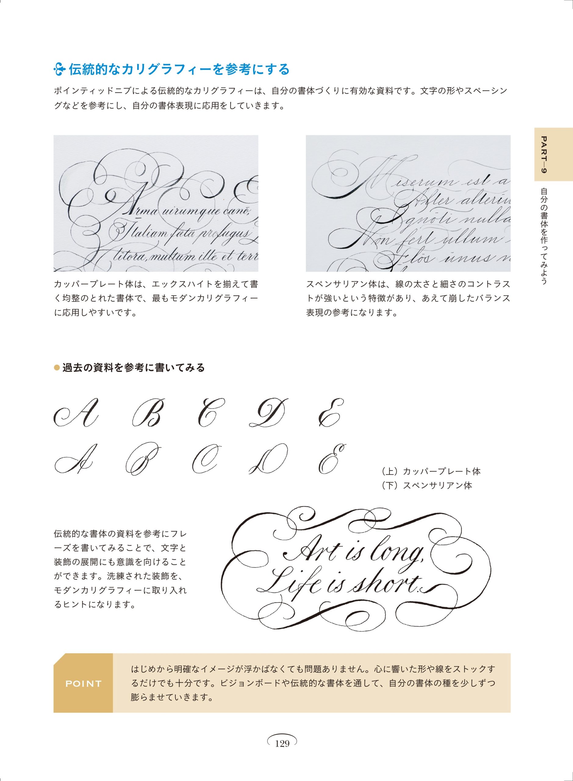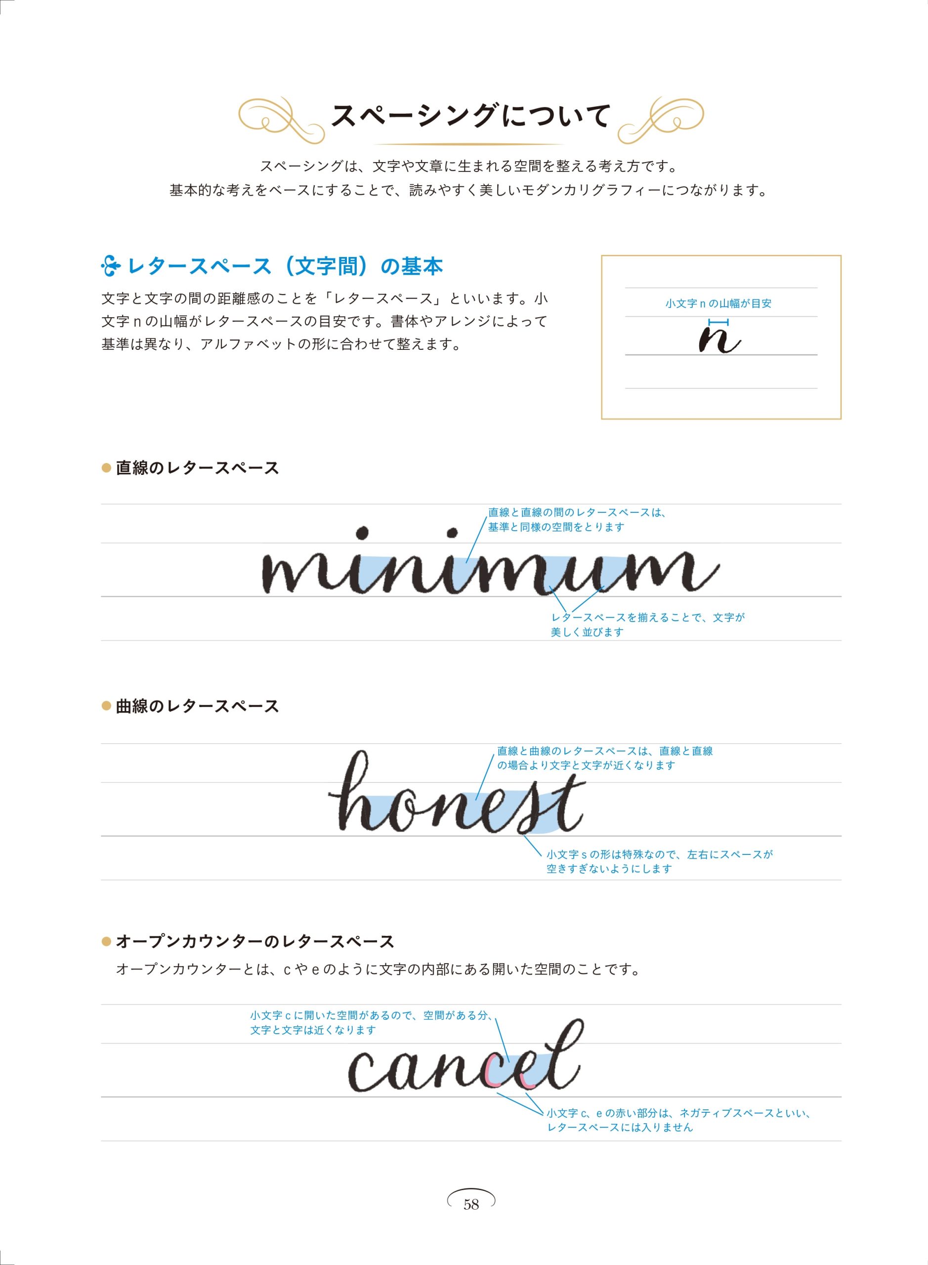 カリグラフィーの初心者でも自由に文字が描けるように、伝統的なルールに基づいた文字の傾きや位置、複数の文字のつなげ方、文字同士の空きやフローリッシュ(文字の周りにつける手書きの装飾線)の描き方などを丁寧に解説。そのうえで、典型的な5つのモダンカリグラフィーの書き方をレクチャーします。
