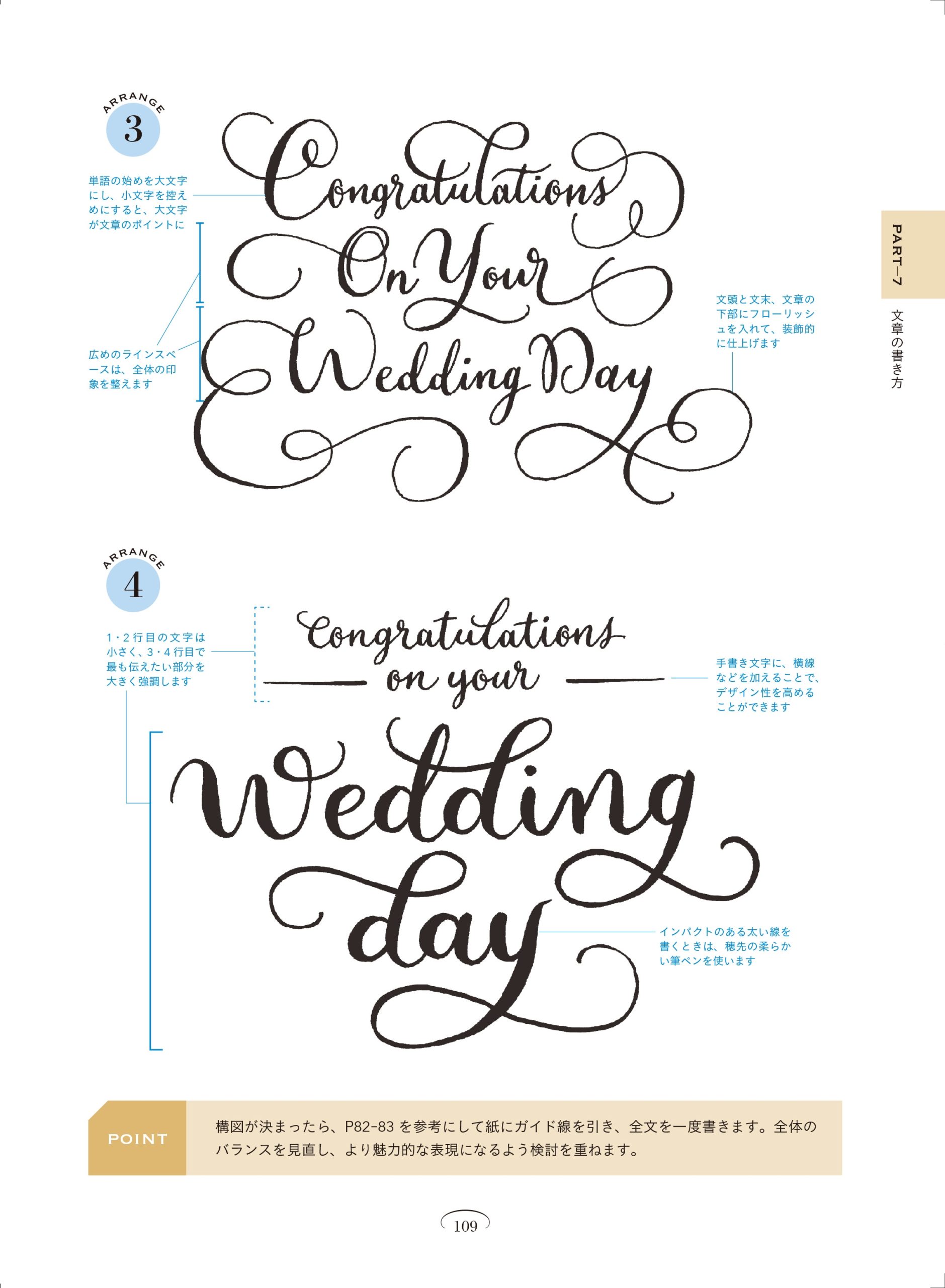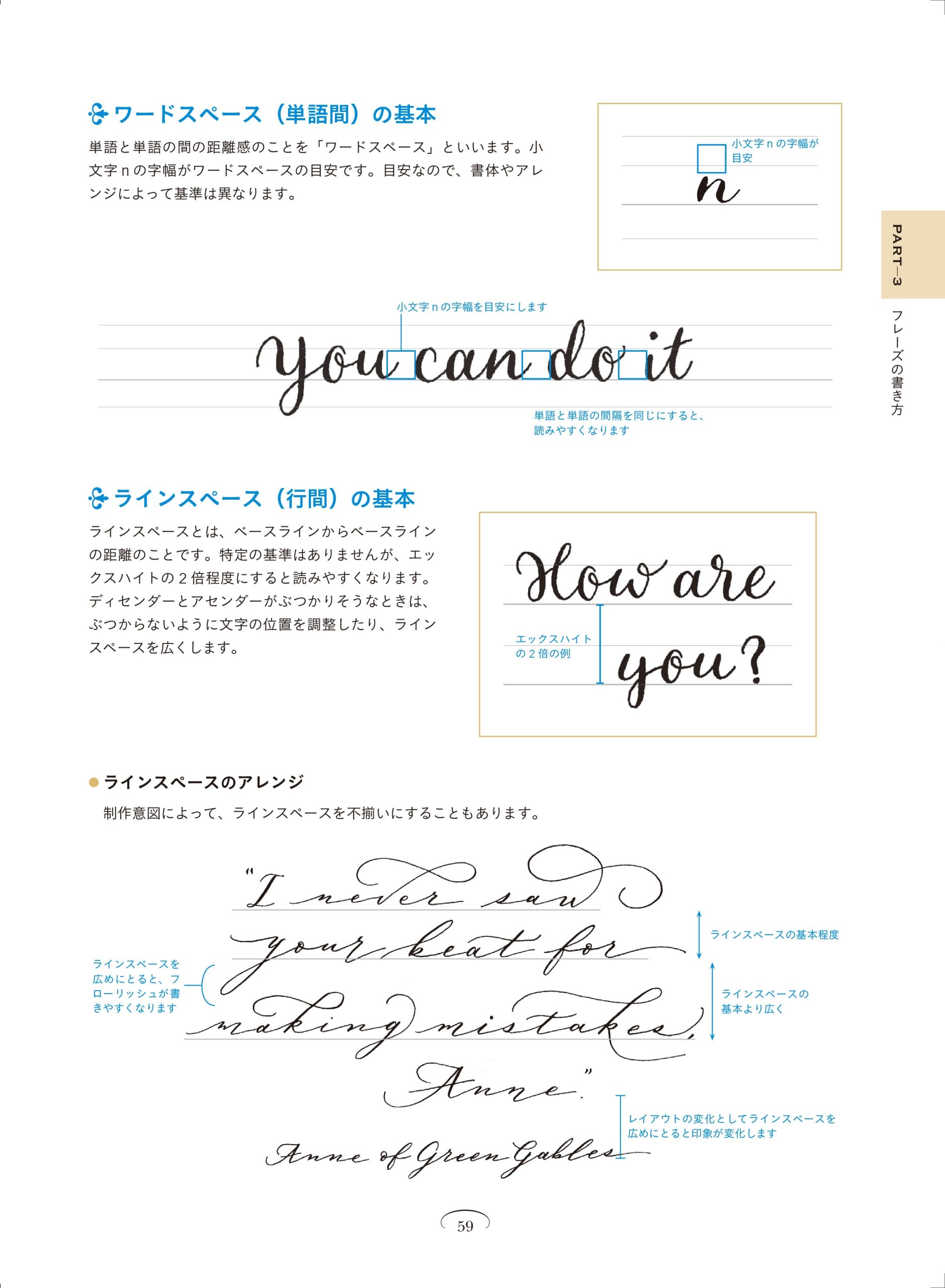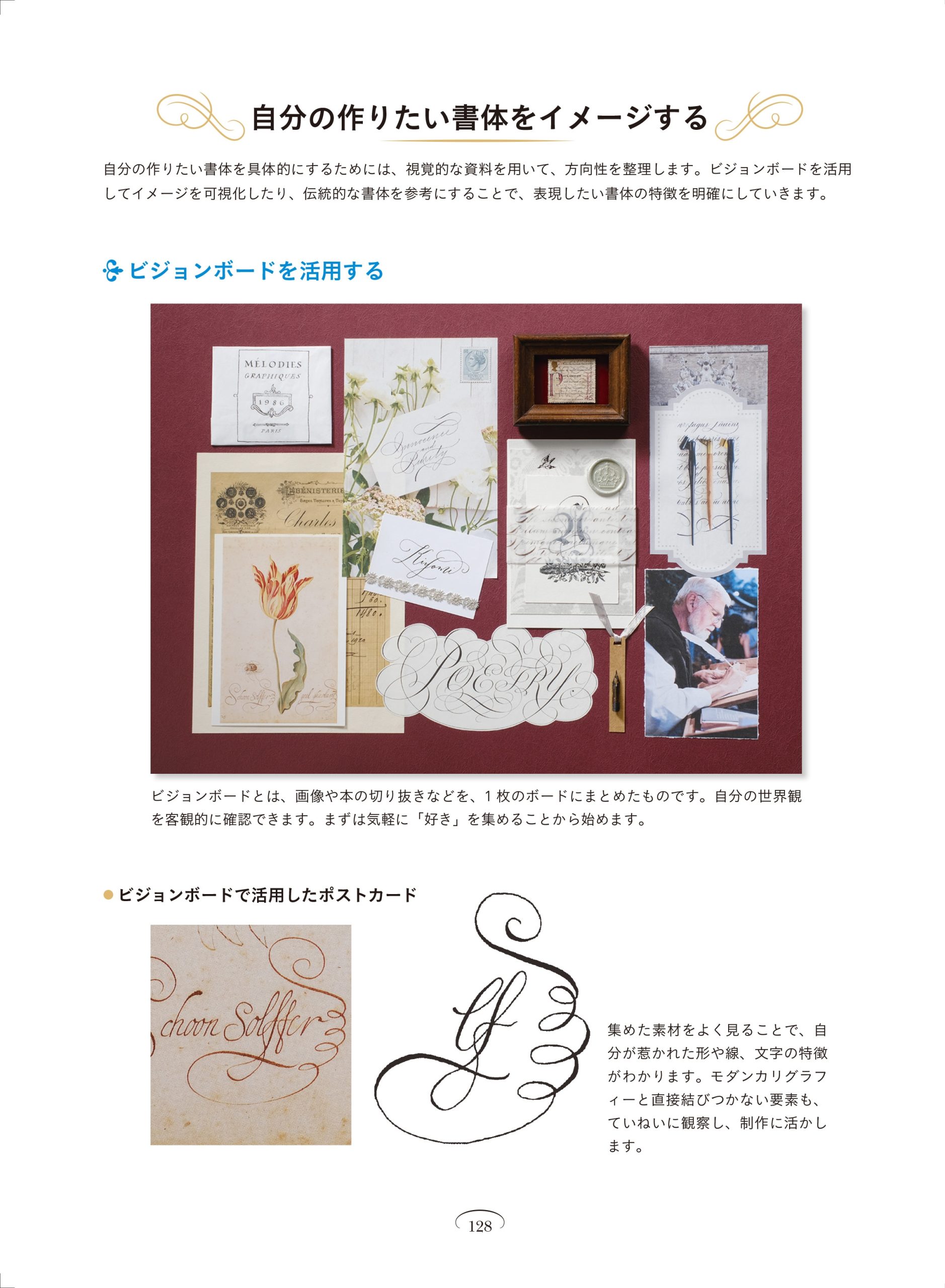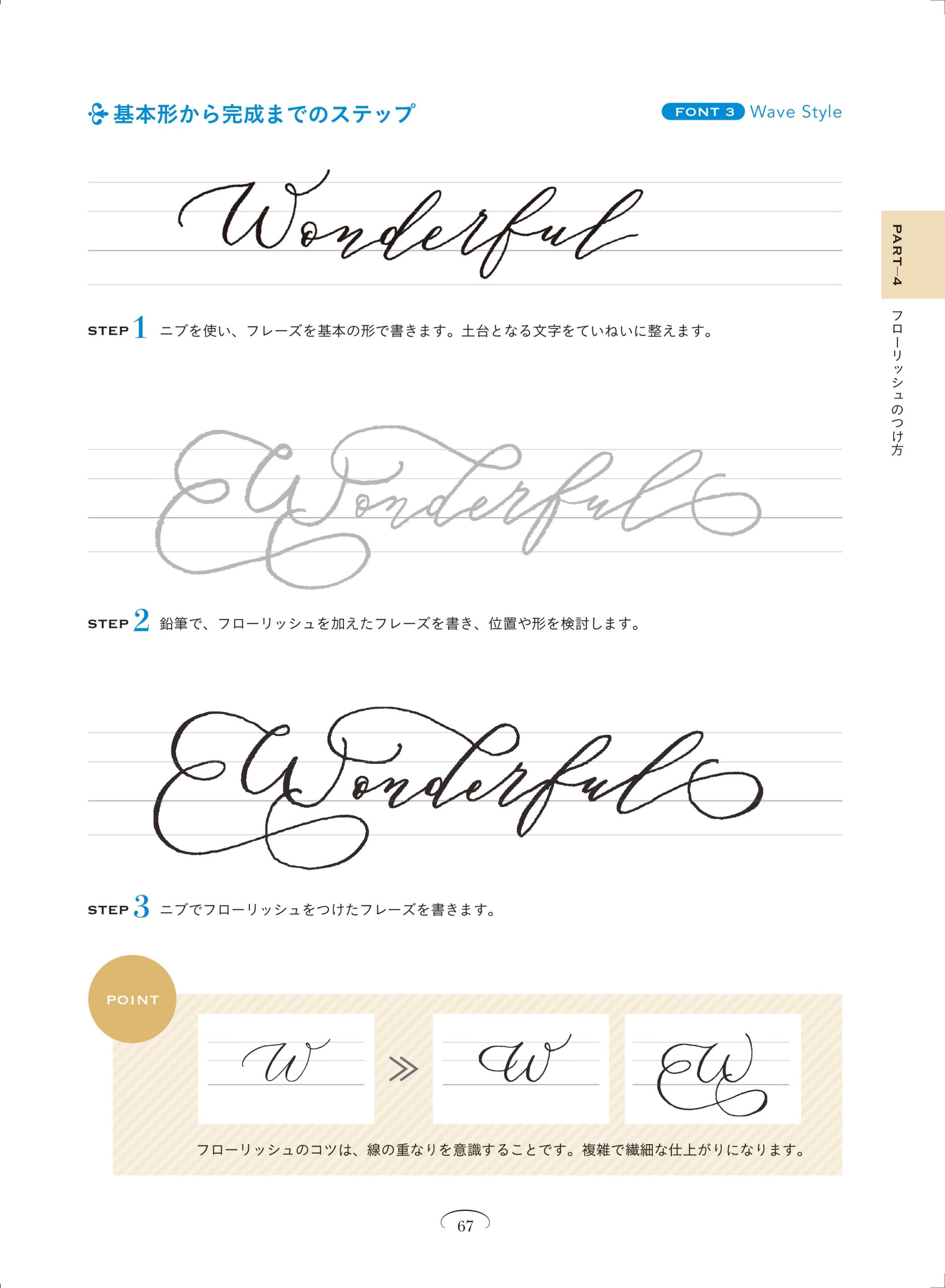 カリグラフィーの初心者でも自由に文字が描けるように、伝統的なルールに基づいた文字の傾きや位置、複数の文字のつなげ方、文字同士の空きやフローリッシュ(文字の周りにつける手書きの装飾線)の描き方などを丁寧に解説。そのうえで、典型的な5つのモダンカリグラフィーの書き方をレクチャーします。