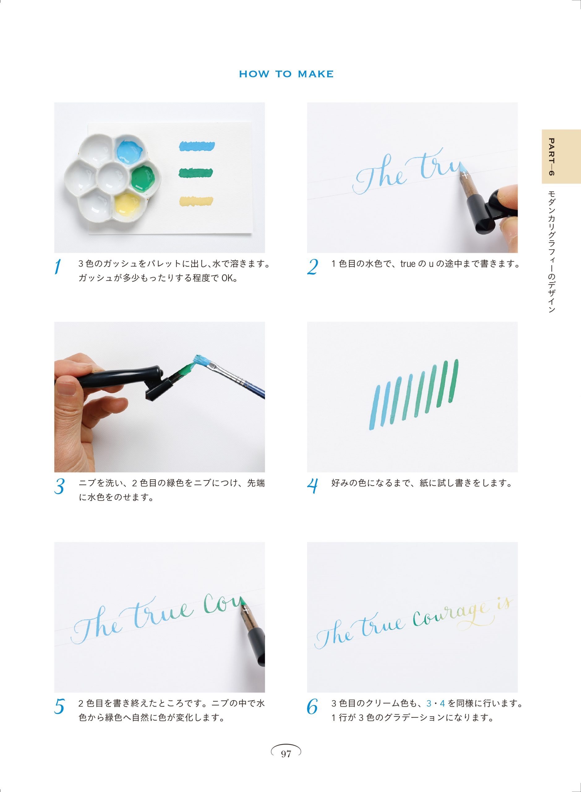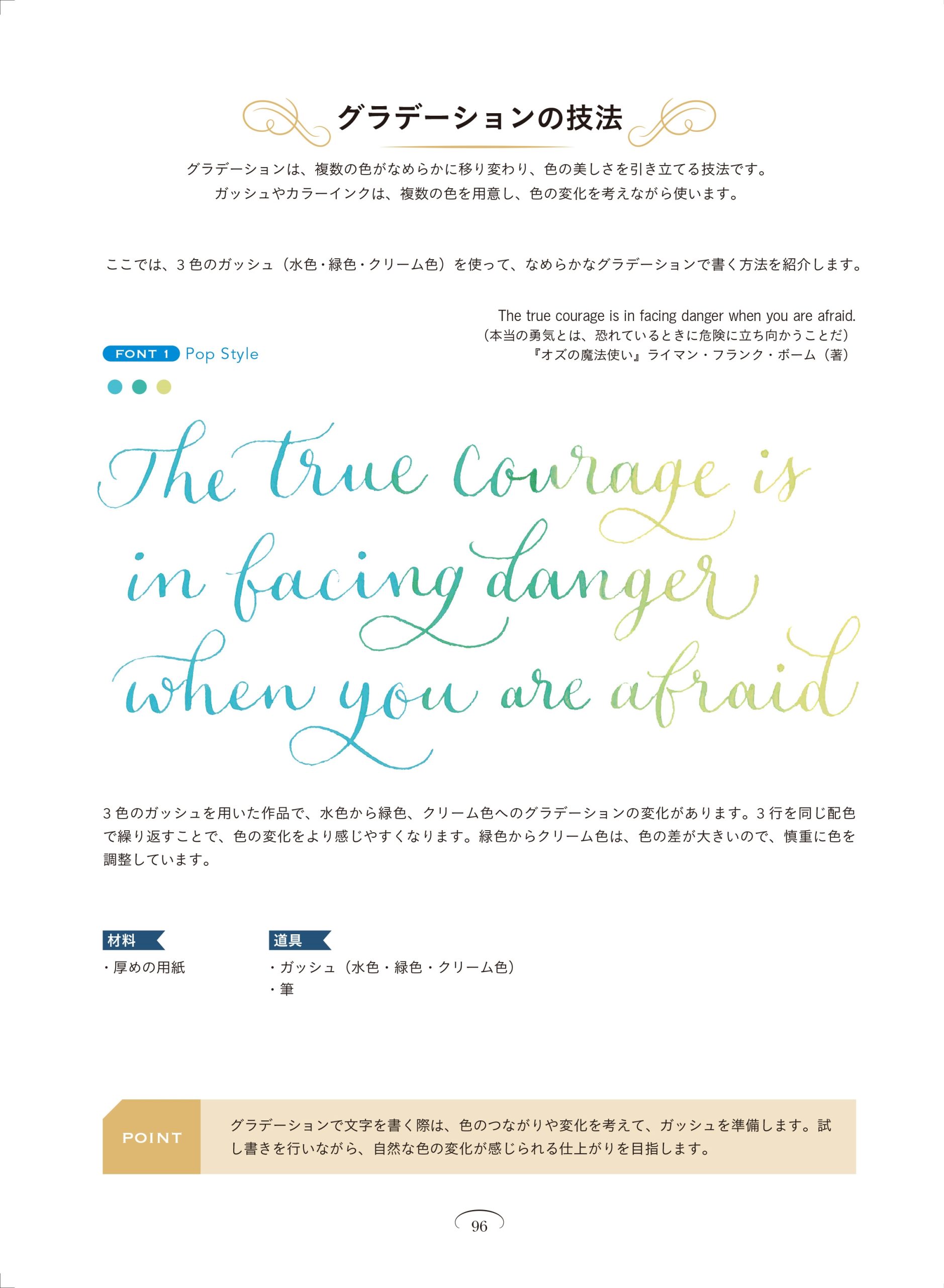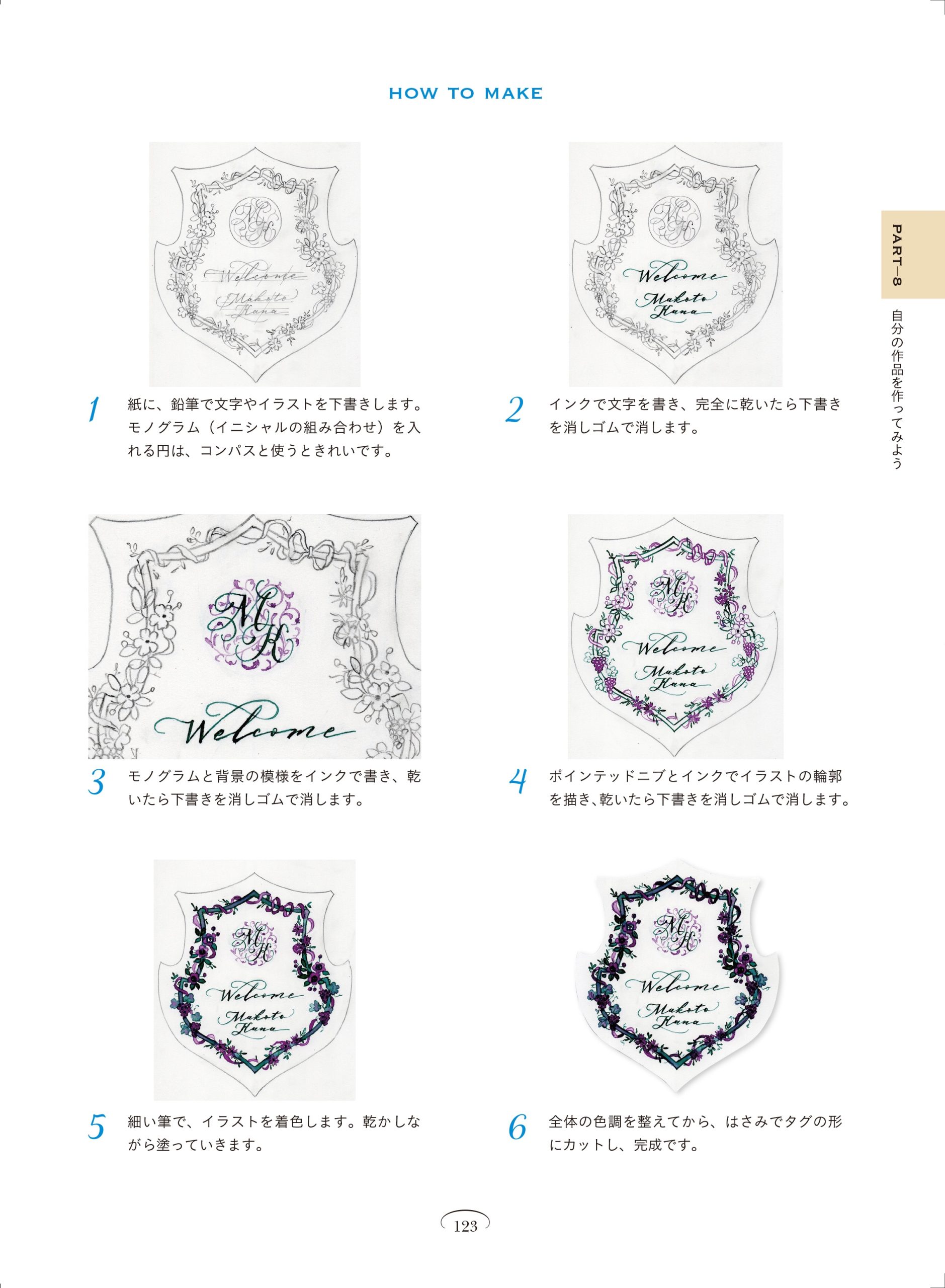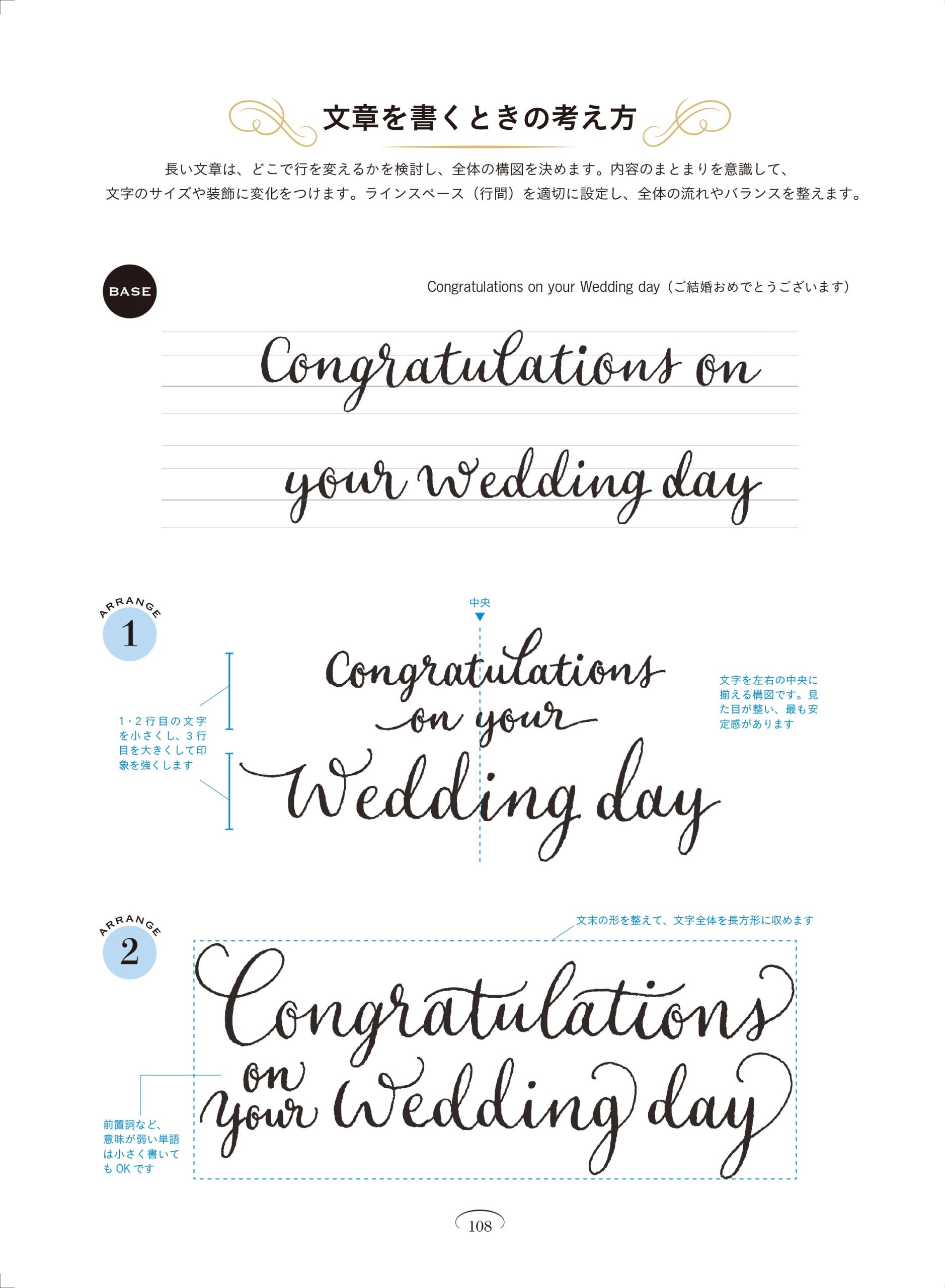 カリグラフィーの初心者でも自由に文字が描けるように、伝統的なルールに基づいた文字の傾きや位置、複数の文字のつなげ方、文字同士の空きやフローリッシュ(文字の周りにつける手書きの装飾線)の描き方などを丁寧に解説。そのうえで、典型的な5つのモダンカリグラフィーの書き方をレクチャーします。