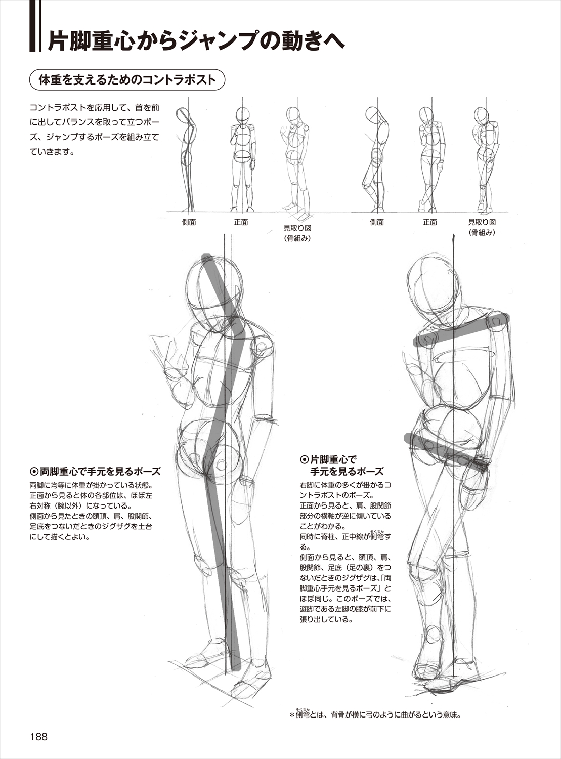 自然な動きのある全身像を描くには、体重の掛け方を変えて重心をズラし、ひねりを加えるとよい。その一例として「コントラポスト」を紹介。