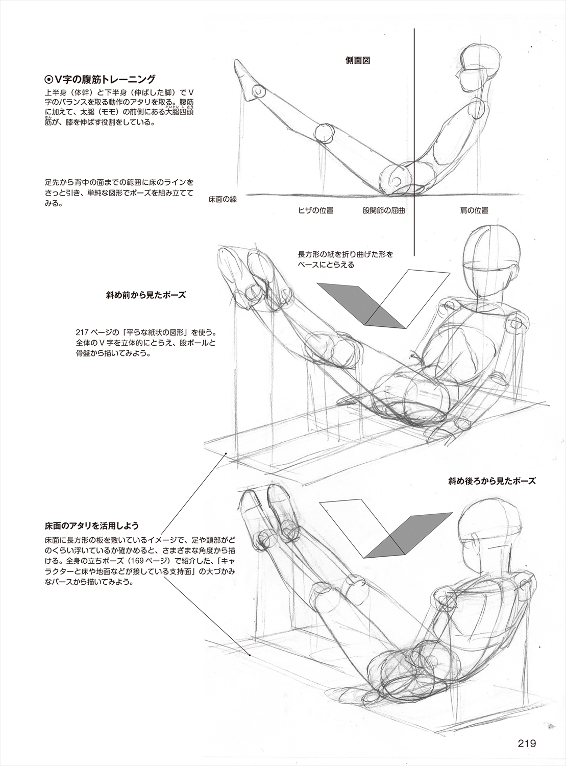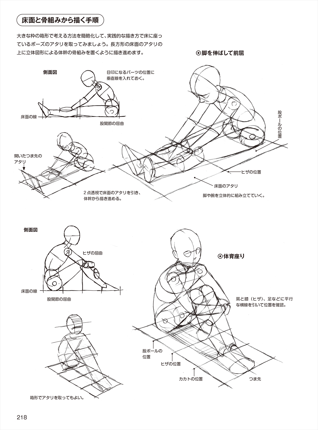 座るポーズを描くには、想定の股ボールで座面に接するお尻の位置を決める。寝るポーズを描くには、体が床に接している面をとらえることが重要。