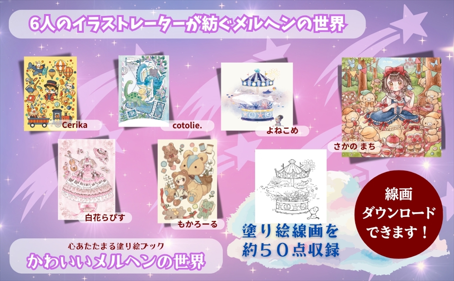 またご購入特典として掲載された線画のダウンロードをご用意。何度でもいろいろな色で塗り絵を楽しむことが可能です(URL後日公開)。