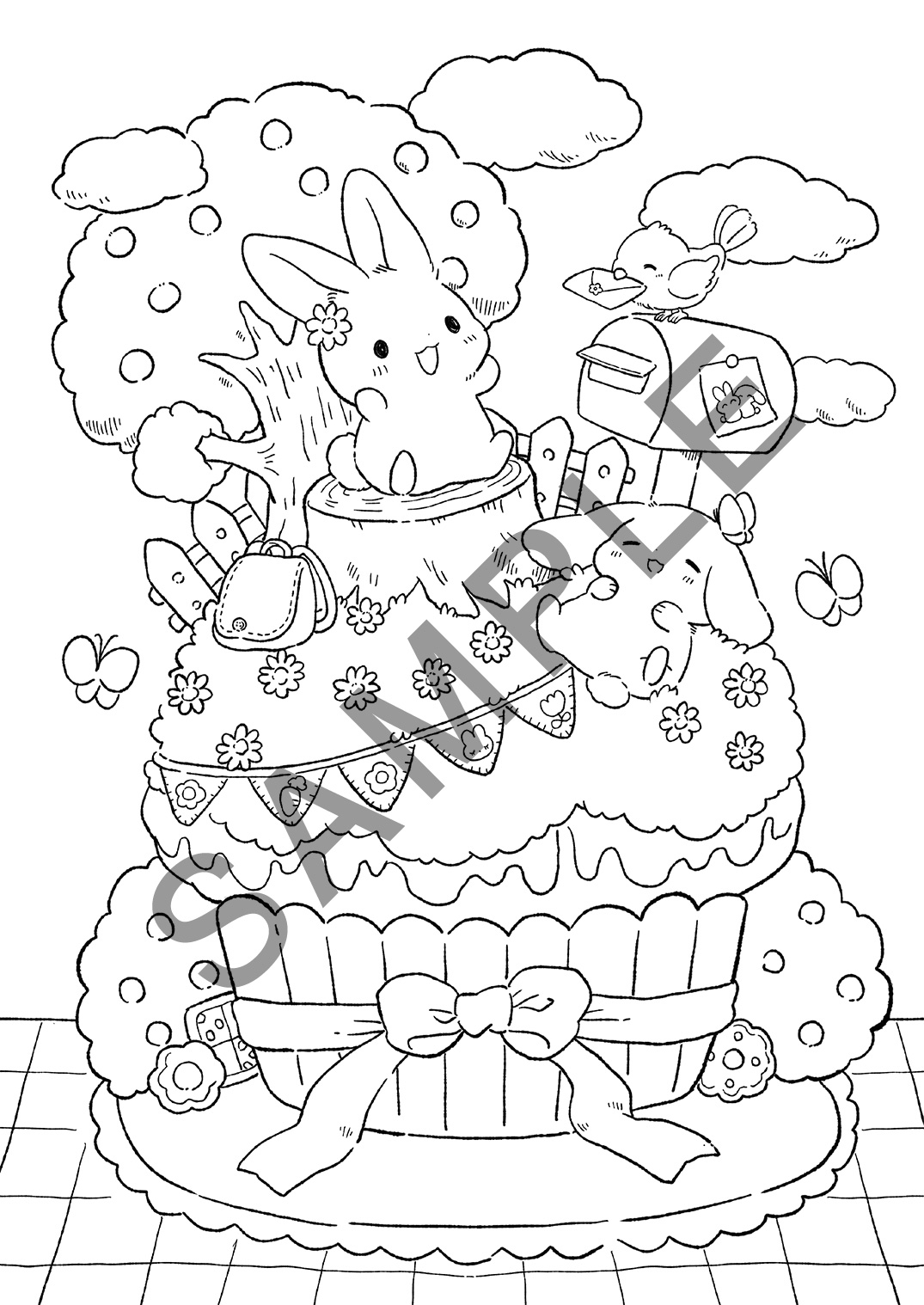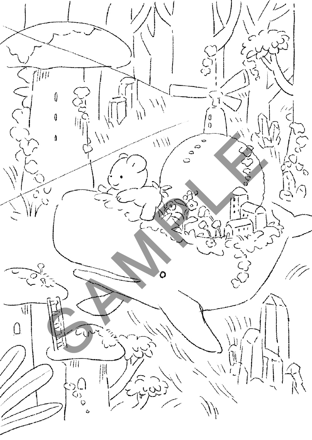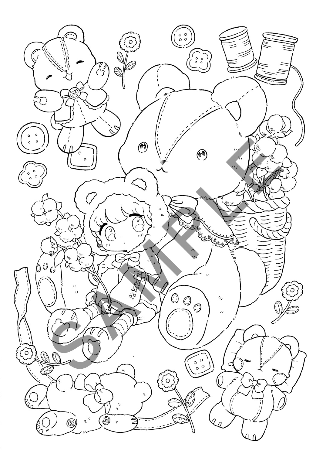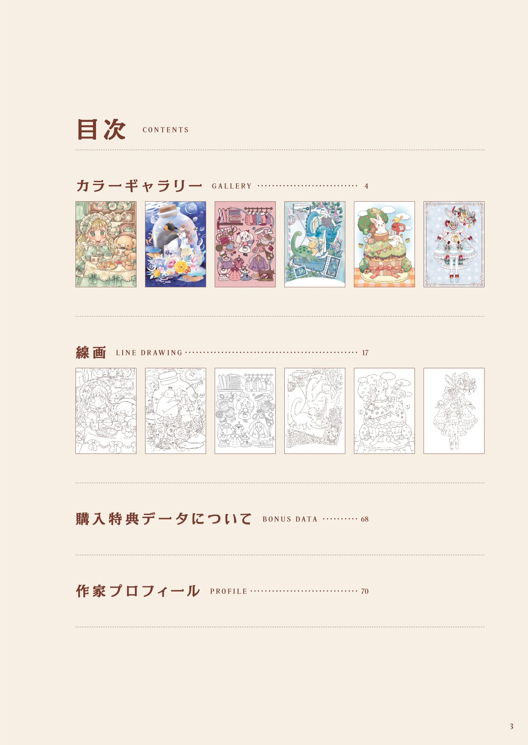 ほんわかとした動物たちや小物、かわいい洋服に身を包んだ女の子、見ているだけで心がほっとするような、ぬくもりあふれる空間を描いた線画を約50点収録しています。