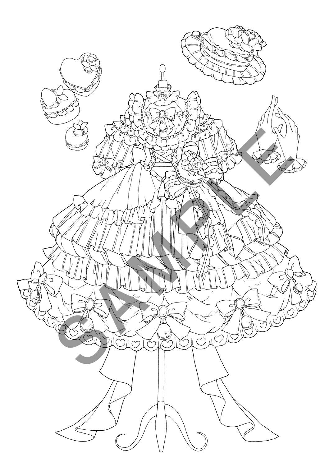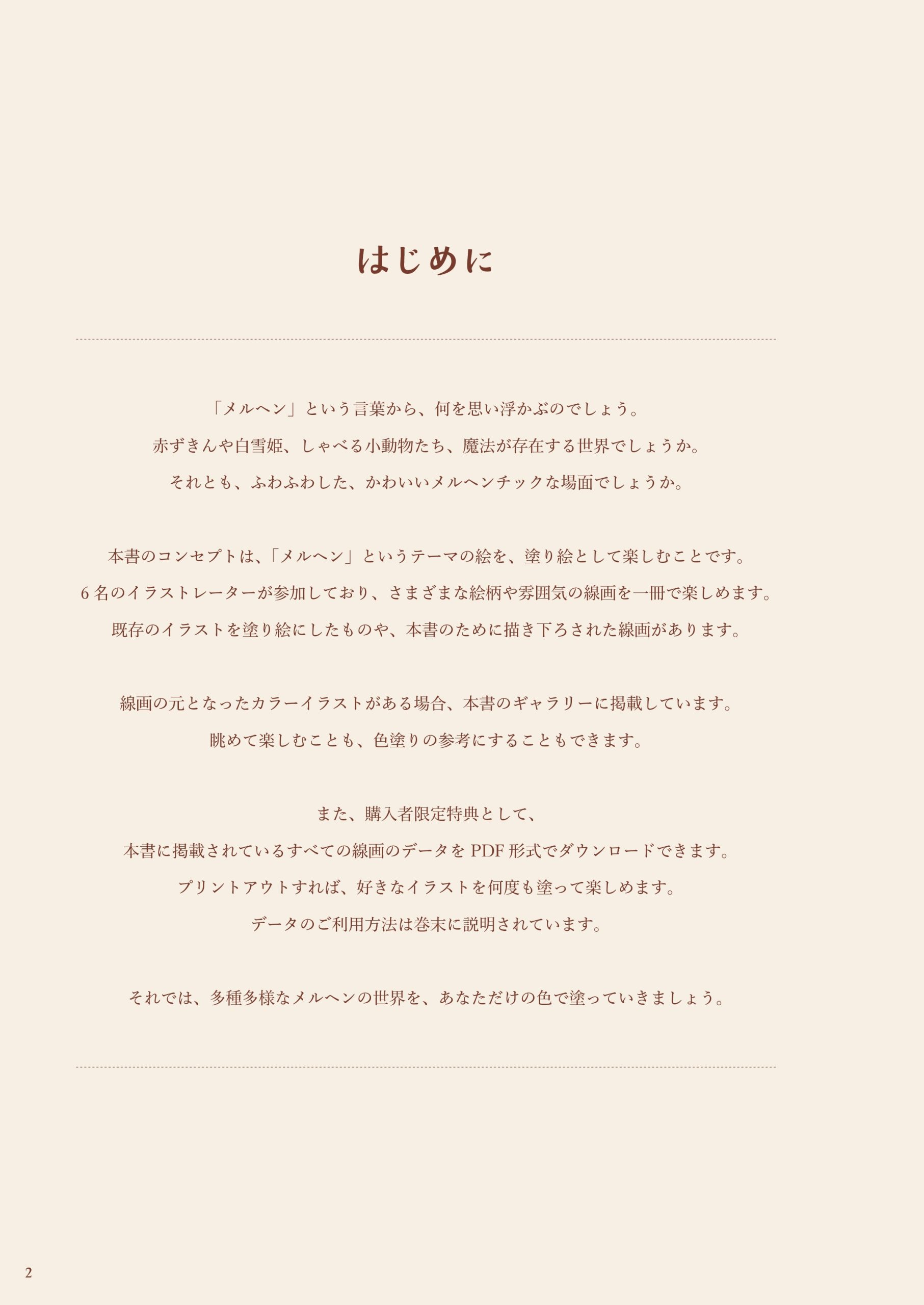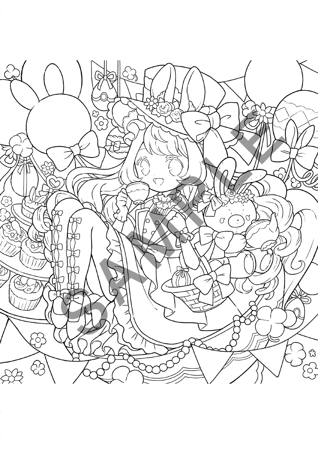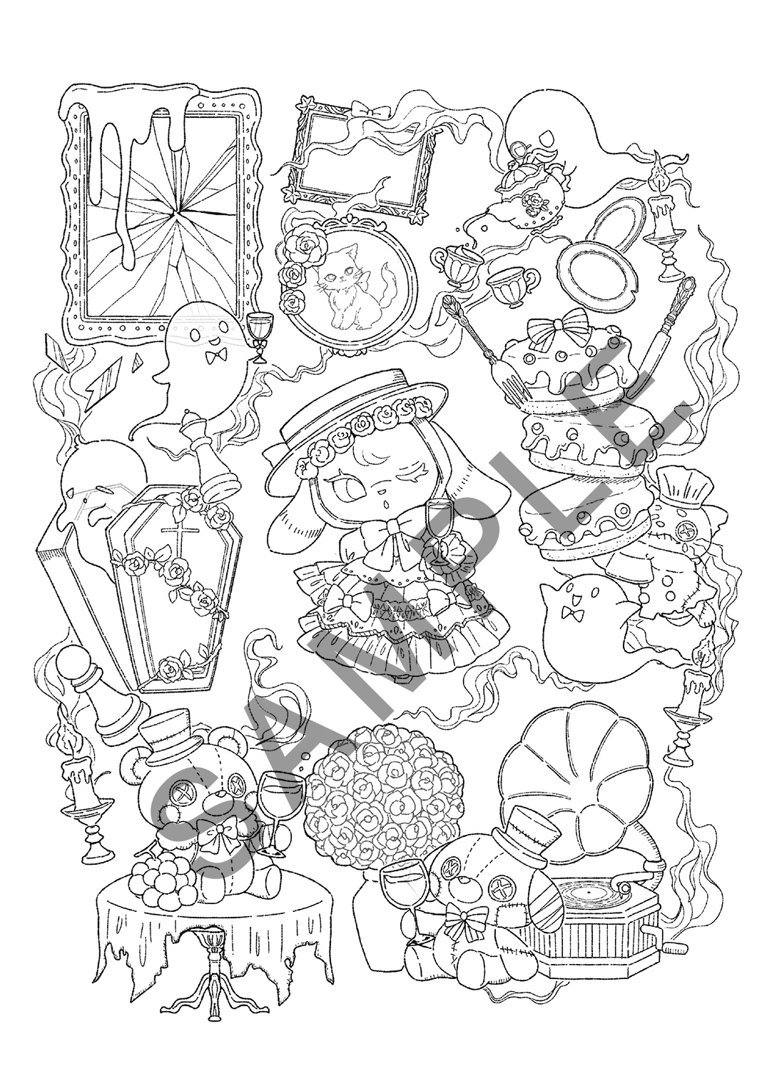 ほんわかとした動物たちや小物、かわいい洋服に身を包んだ女の子、見ているだけで心がほっとするような、ぬくもりあふれる空間を描いた線画を約50点収録しています。